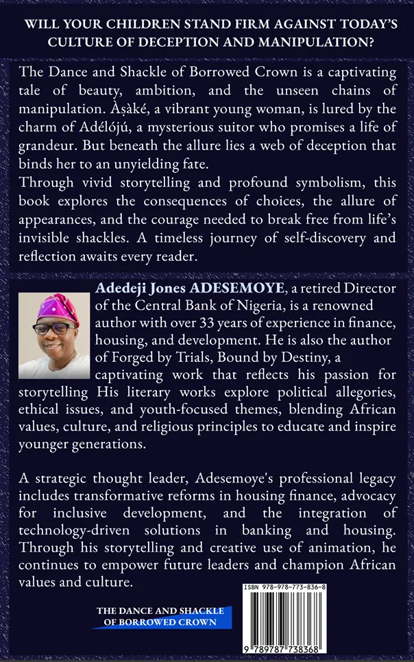Àṣàké is lured by Adélójú’s false grandeur across rivers of illusion and betrayal—only to find herself bound by invisible shackles. The Dance and Shackle of Borrowed Crown is a timeless allegory of power, leadership, and the danger of choosing charm over truth.